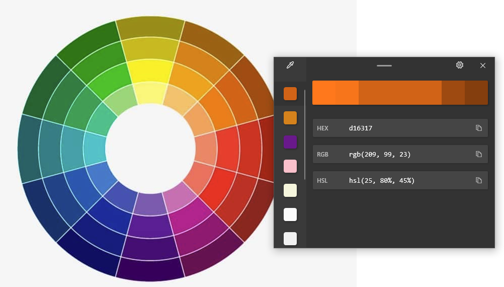 Esta herramienta es muy útil si estamos trabajando en el diseño de colores de, por ejemplo, una página web. Con el comando «Windows+Shift+C» se nos colocará en el ratón la herramienta para seleccionar un color. Una vez elegido nos enseñará el color en el formato que queramos. Tiene una gran cantidad de formatos que podremos elegir usar: HEX, RGB,HSL,HSV,CMYK,HSB,HSI,HWB, Decimal…
