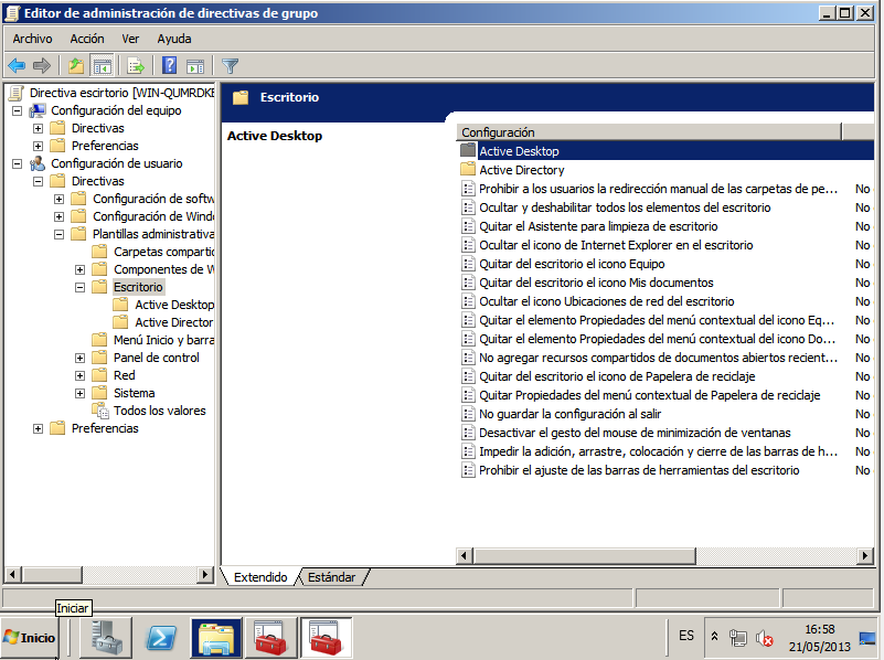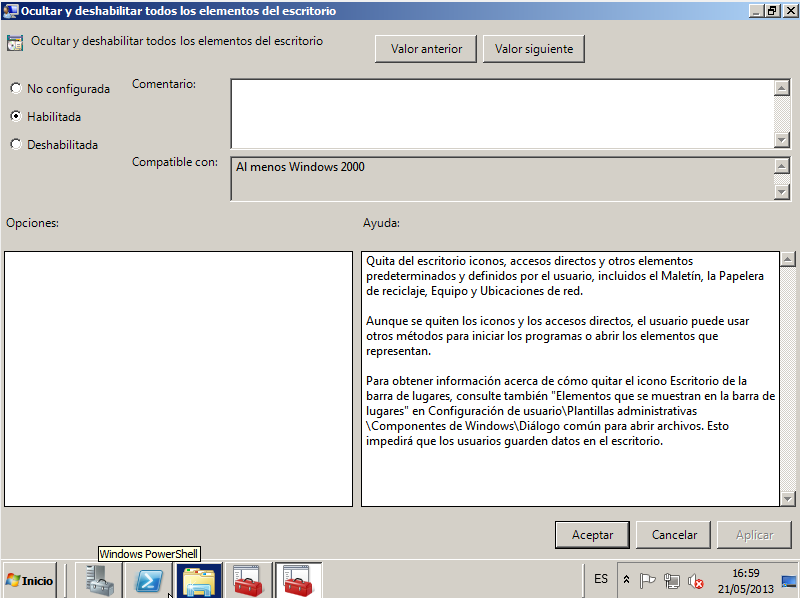- Se configura en: Configuración de usuario – Plantillas Administrativas – Escritorio – Ocultar y deshabilitar todos los elementos del escritorio.