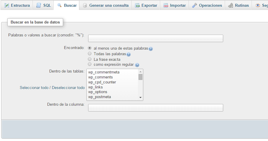 Primero buscaremos en la base de datos todos los registros que conservan todavía el dominio antiguo, para lo cual usaremos la herramienta «buscar» de phpMyAdmin.