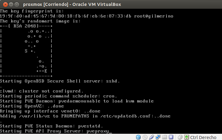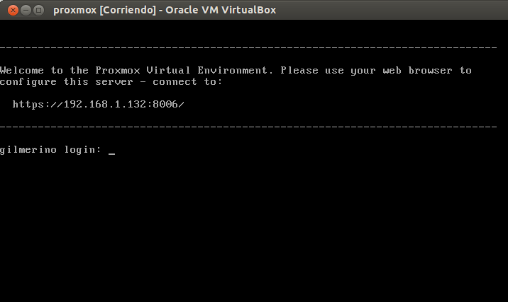 Luego nos da la bienvenida el sistema y nos indica la dirección que tenemos que utilizar para conectar con proxmox mediante el navegador, podemos ver que es mediante el protocolo seguro https y por el puerto 8006.