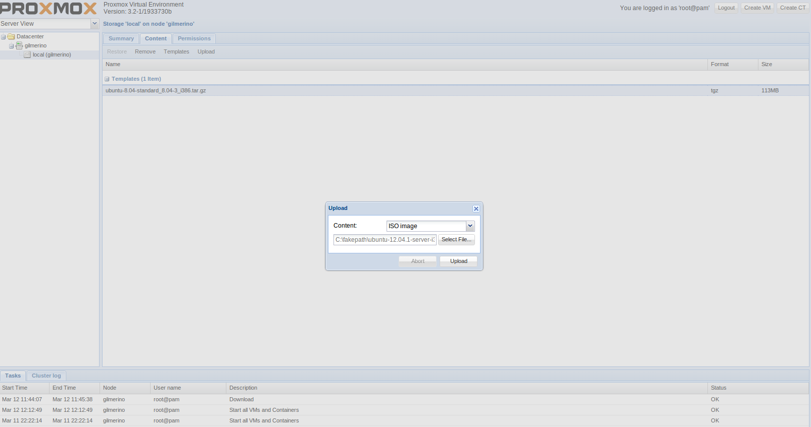 Para instalar un SO debemos subir previamente la ISO mediante el apartado content => Upload.