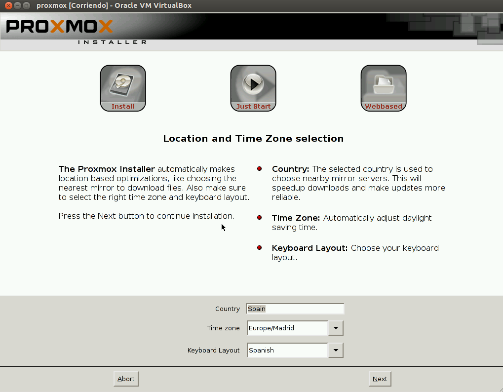 Seleccionamos el país, la zona horaria y la distribución del teclado.