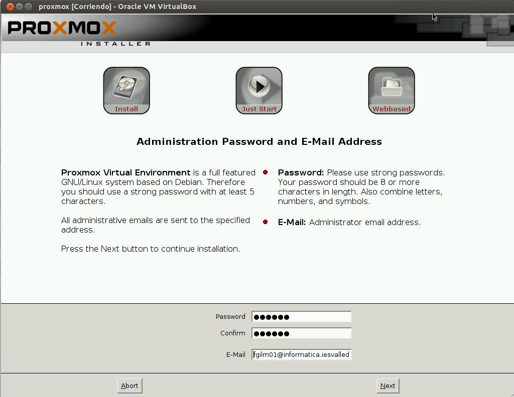 Introducimos la password y un email de contacto para el administrador.