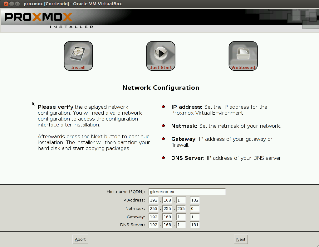 Rellenamos los datos solicitados, nombre del equipo, dirección ip, máscara, gateway y servidor DNS. Para este paso previamente he instalado un Windows Server 2012 agregando el rol de Active Directory creando así un dominio. Es necesario para este paso de la instalación para el apartado FQDN, donde introducimos el dominio creado y en la opción DNS Server, donde introducimos la dirección ip del controlador de dominio creado.