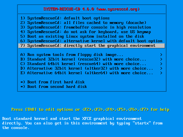 Tiene varias opciones de arranque. Nosotros nos vamos a tirar por la opción gráfica, que es la más fácil de utilizar, aunque también se puede utilizar a través de comandos. Para ello elegimos directamente la opción 7 que nos llevará a la interfaz gráfica sin tener que hacer nada. Al arrancar podemos elegir la opción de teclado y poner la española, aunque no nos servirá de mucho ya que el idioma soportado es únicamente el inglés.