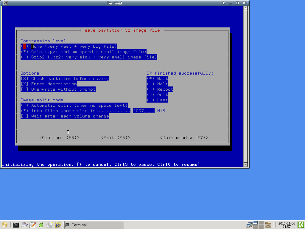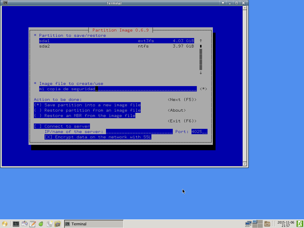 Otra de sus principales herramientas es Partition image, con la que podemos crear copias completas de las particiones de nuestro disco duro. Esta es una muy buena manera de hacer copias de seguridad. Elegimos la partición que queremos copiar y elegimos otra distinta para guardarla. Podemos poner opciones como chequear la copia que hemos hecho, el tipo de compresión o que puede hacer el ordenador al terminar de trabajar en la copia.