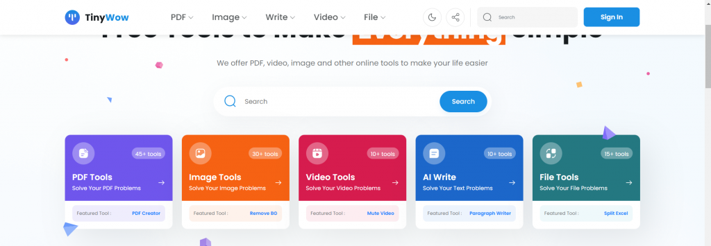 TinyWow es una página web que cuenta con 41 funciones diferentes para poder trabajar con pdf, imágenes,videos,escritura o ficheros, en resumen para editar todo tipo de archivos