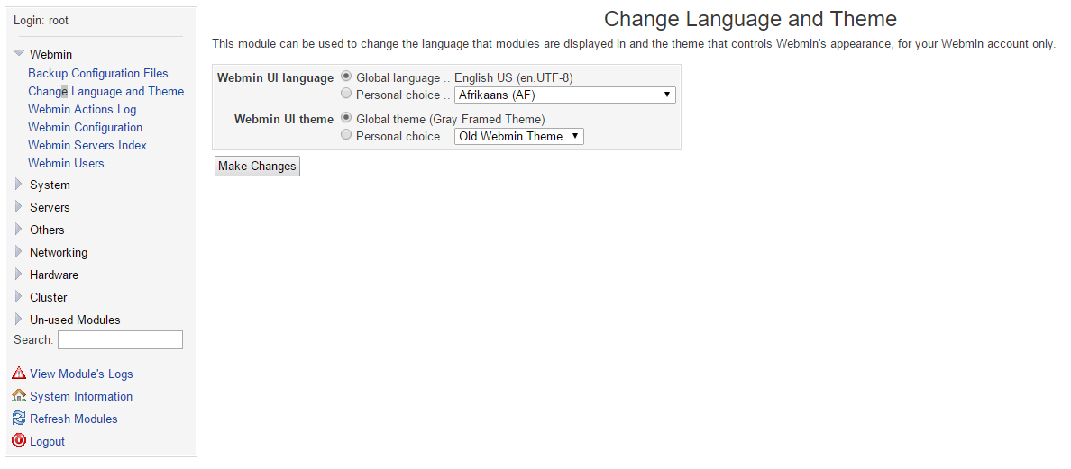 En el primer apartado de Webmin UI language será donde cambiaremos el idioma predeterminado de Webmin y seleccionaremos el español o el idioma natal de su pais