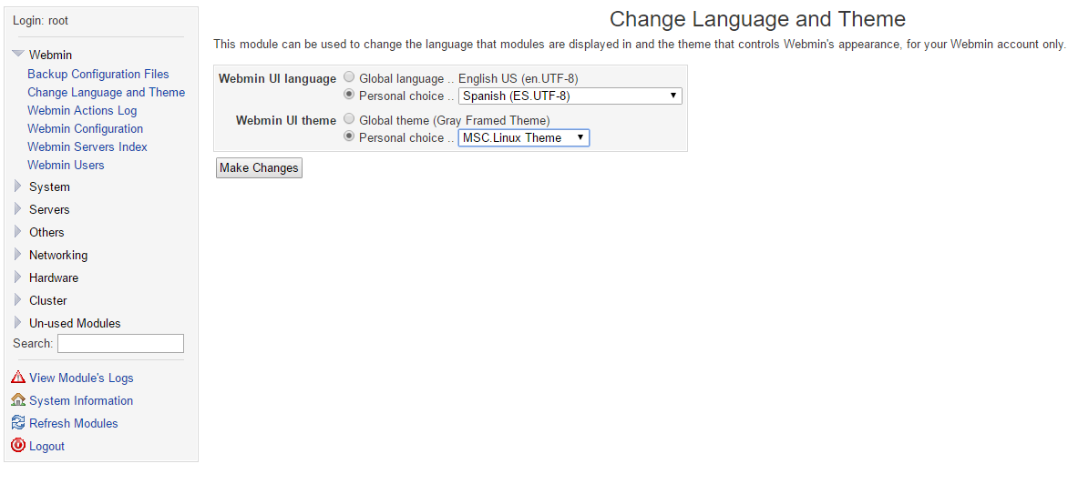 En el segundo apartado de Webmin Webmin UI theme será donde se cambiará el tema por defecto del Webmin y por ejemplo yo puse de tema el MSC.Linux Theme
