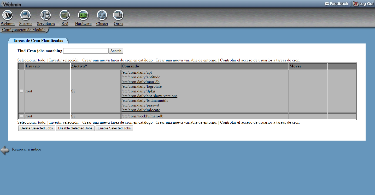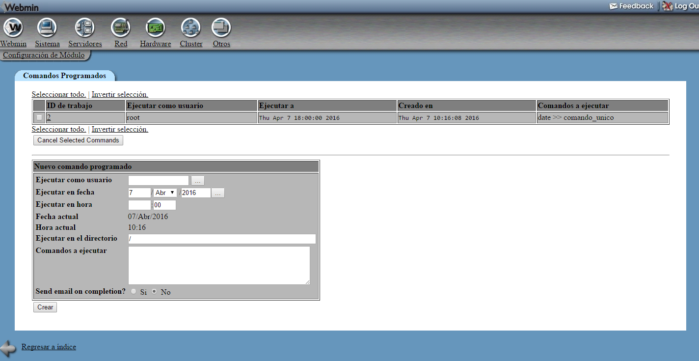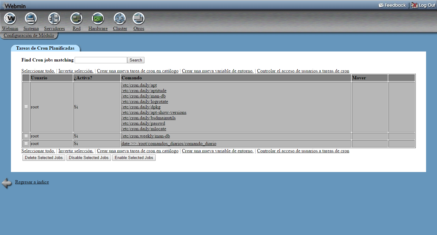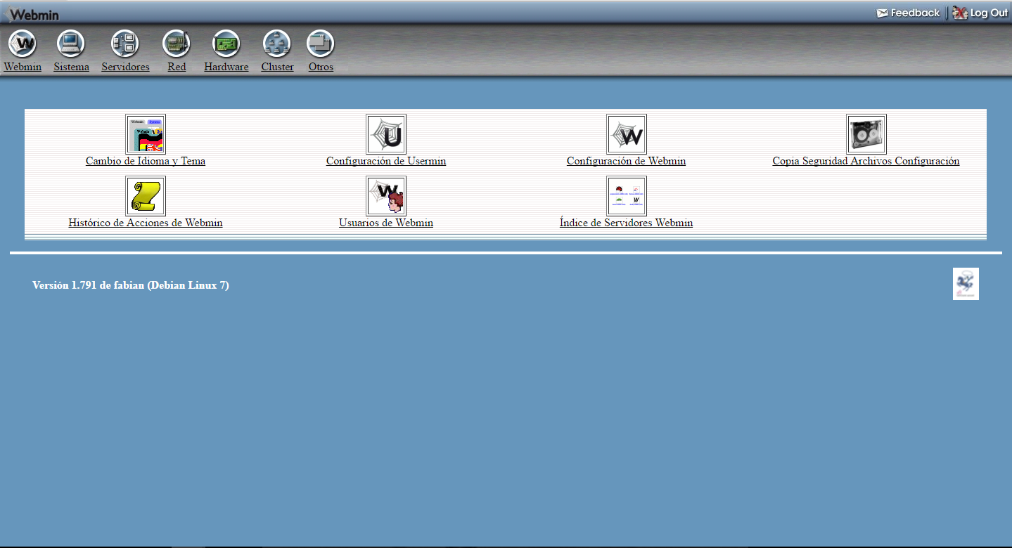 Y ya tendremos Webmin en el idioma a usar y tema preferido y planificaciones horarias de comando