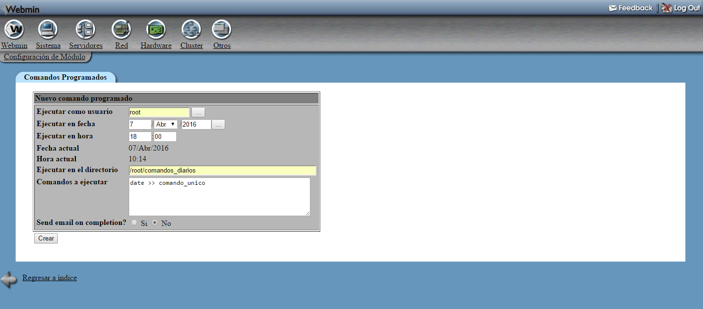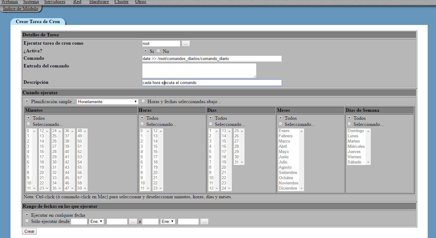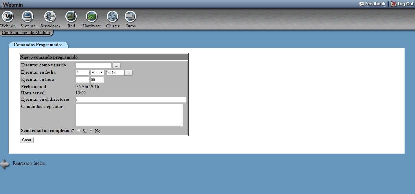 Una vez configurado el idioma y el tema predeterminado de Webmin pasaremos al siguiente apartado y será el programar comandos planificados, lo cual significa que programaremos una serie de comando que el servidor hará regularmente todas las veces que se le indique y los días que se le indique.