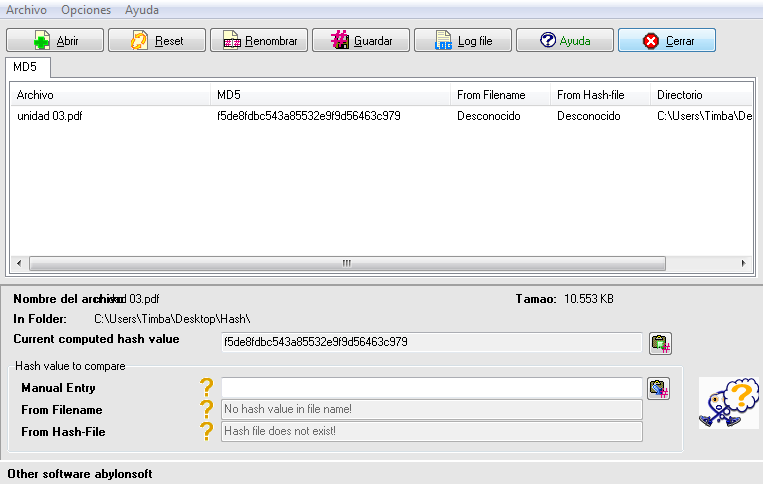 Cargas el archivo que quieres comparar y te da un MD5 único para ese archivo, y abajo aparece una opción, en el apartado hash value to compare => manual entry, que te compara y te hace la suma de comprobación o checksum con el fabricante, que es donde debes introducir la numeración facilitada por el fabricante.