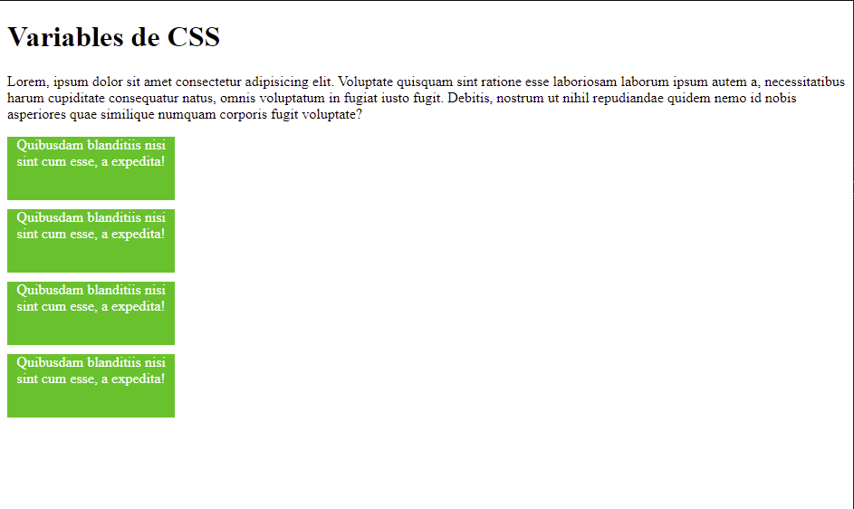 En este ejemplo imaginemos que los rectángulos morados son botones con accesos directos a otros apartados de la página, si finalmente no nos gusta ese color lo único que debemos hacer será cambiar directamente la variable que le tenemos asignada al color principal de los botones, sería de esta manera: