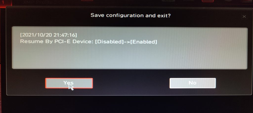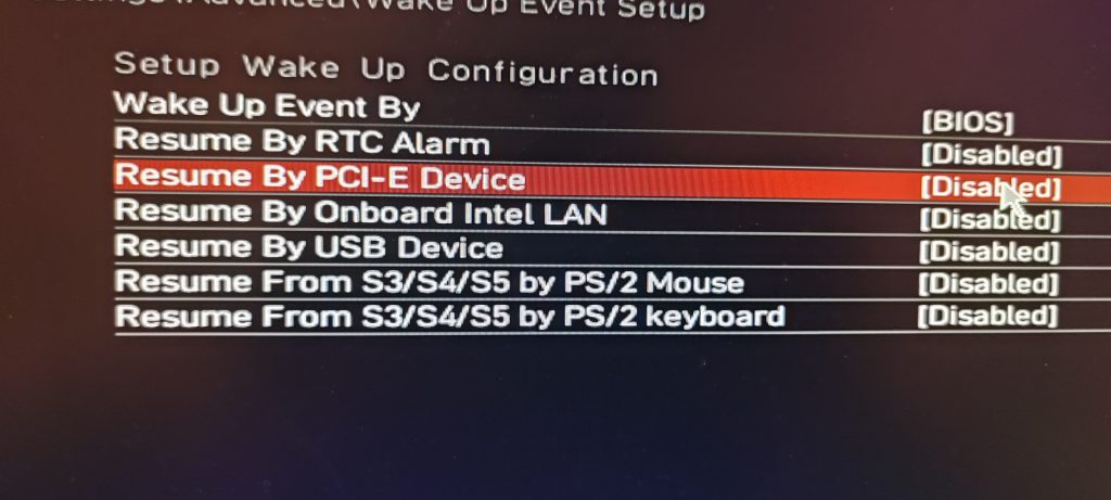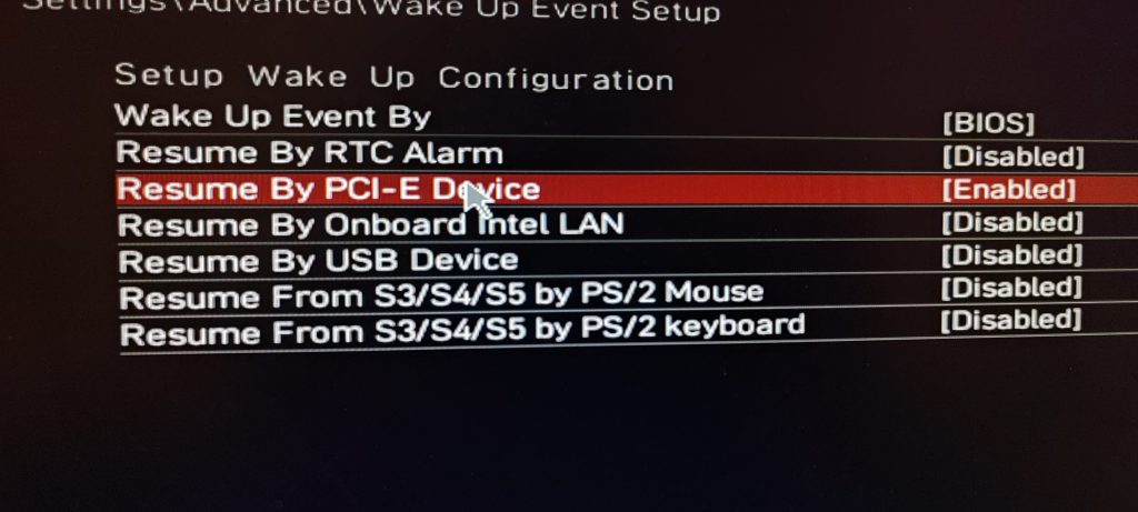 Primeramente y como vimos anteriormente debemos tener activado en la BIOS/UEFI la opción llamada Resume By PCI-E Device.