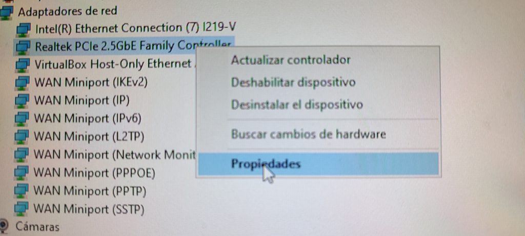 Una vez que hayamos guardado la configuración e iniciemos nuestro equipo nos iremos al administrador de dispositivos de Windows 10, una vez allí iremos a Adaptadores de red, elegiremos nuestra tarjeta de red e iremos a las propiedades.