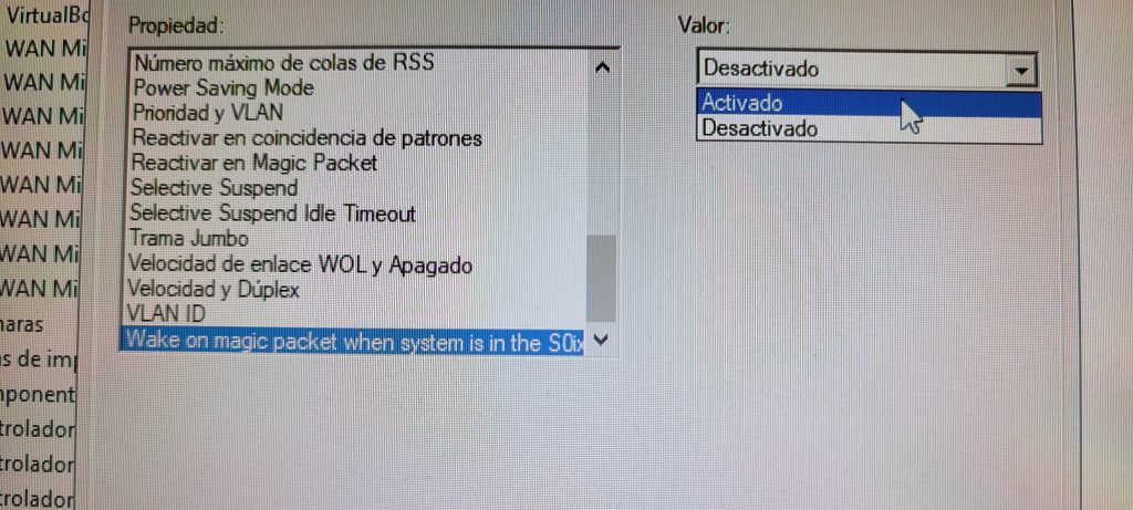 Una vez dentro de las propiedades nos iremos a las opciones avanzadas, bajaremos hasta abajo y encontraremos una opción llamada Wake on magic packet, entraremos dentro de la opción y la activaremos.