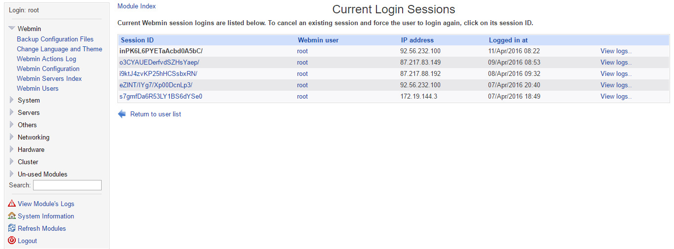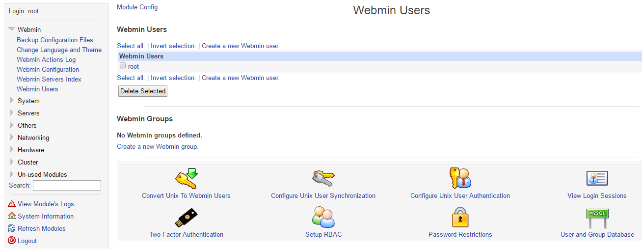 En la pestaña de la izquierda ,Webmin, Webmin Users.